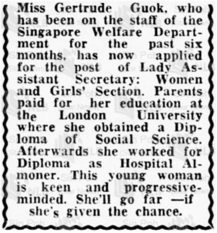 Gertrude pursued Economics, Political and Social Science at the London School of Economics. After graduating in 1950 with an honours degree, she returned to Singapore and commenced work at the public social welfare department for six months before being offered the role of Lady Assistant Secretary and Head of the newly established Counselling and Advice Department.