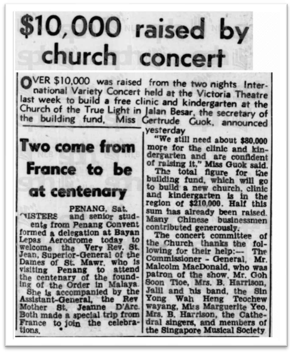 In January 1952, she organised a fund-raising concert that helped raise $10,000 to build a free clinic and kindergarten at the Church. She donated funds to the Singapore Bible College in the 1960s to help raise building funds for the College’s new premises at Adam Road.