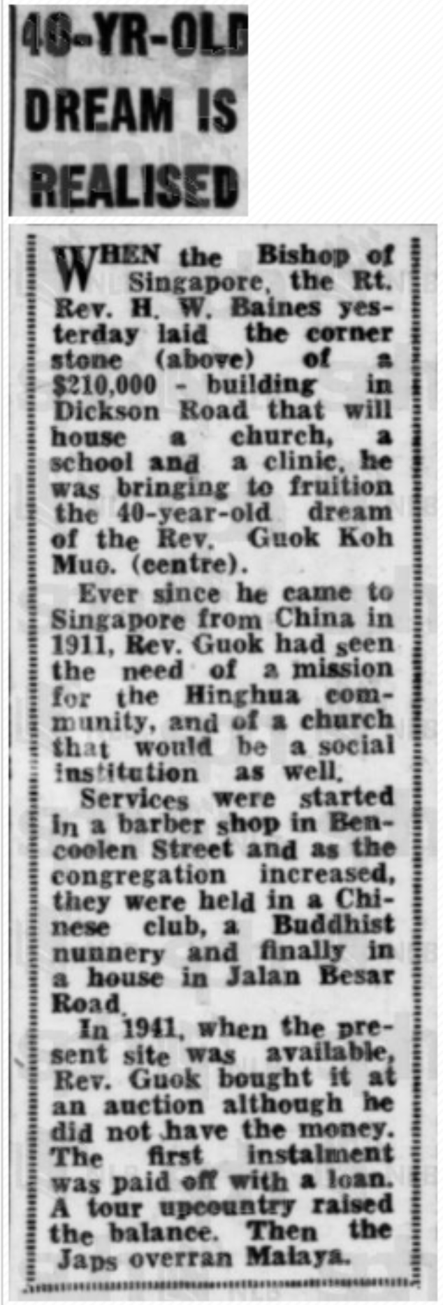 He started regular gospel meetings in the evenings with a few of his fellow Christians from the Heng- Hua community in a barber shop in Bencoolen Street. The group quickly grew in numbers and had to move premises to fit the congregation in a house in Jalan Besar, which is where Rev. (Canon) Guok later established Church of The True Light. In 1941, when an opportunity arose to permanently settle into a more suitable location, he purchased the land where the church currently sits on at an auction and paid off the first instalment with a bank loan, and subsequently managed to raise the remaining funds by organising evangelistic tours in Malaya, now known as Malaysia.