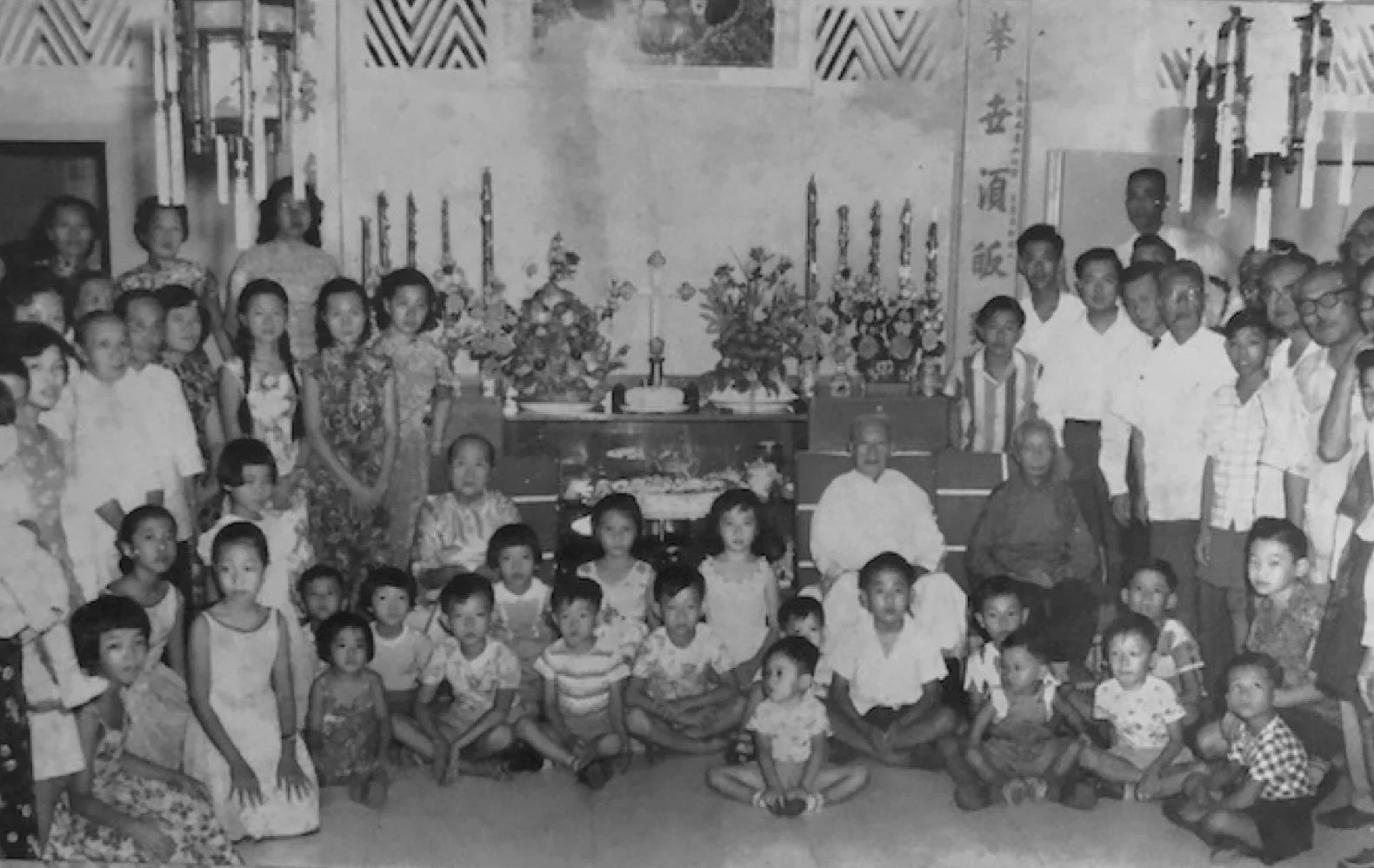 Rev. & Mrs. Guok with all the family at Rev. Guok's Seventieth birthday and Golden Wedding Celebration. circa 1959.